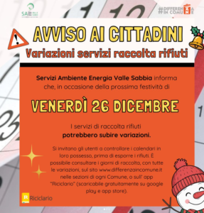 In occasione della festività di giovedì 25 dicembre, i servizi di raccolta rifiuti potrebbero subire variazioni nei diversi Comuni. 👉...